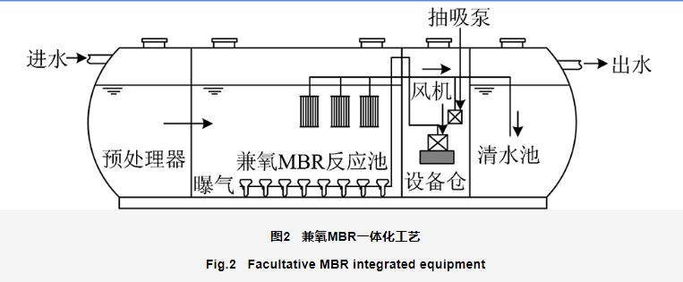 為減少膜污染、提升膜壽命,王陽等[41]發(fā)明了一種旋轉(zhuǎn)膜生物氣升式循環(huán)反應(yīng)器,其中膜過濾裝置包括旋轉(zhuǎn)接頭和曝氣管,膜組件可通過旋轉(zhuǎn)接頭驅(qū)動旋轉(zhuǎn),該發(fā)明降低了設(shè)備能耗,減少了維護(hù)成本。為驗(yàn)證工藝在北方寒冷地區(qū)的適用性,晁雷等[42]在遼寧省某村生活污水處理中采用兼氧MBR分散式污水處理與回用一體化工藝(圖2),工程試運(yùn)行發(fā)現(xiàn),采用地下埋置保溫方式,在溫度低的北方冬季該工藝能正常運(yùn)行,兼性厭氧菌可適應(yīng)含氧量變化,適用于進(jìn)水量波動大的農(nóng)村地區(qū)的生活污水處理,出水能穩(wěn)定達(dá)到GB 18918—2002一級B標(biāo)準(zhǔn)。